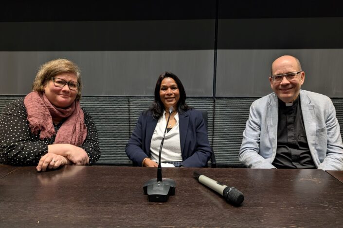 Suomen Lähetysseuran toiminnanjohtaja Pauliina Parhiala (vas.), tohtori Anupama Hial Luterilaisesta maailmanliitosta ja Kylväjän lähetysjohtaja Magnus Riska viittoivat suuntia tulevaisuuden lähetystyölle. Kuva: Danielle Miettinen.
